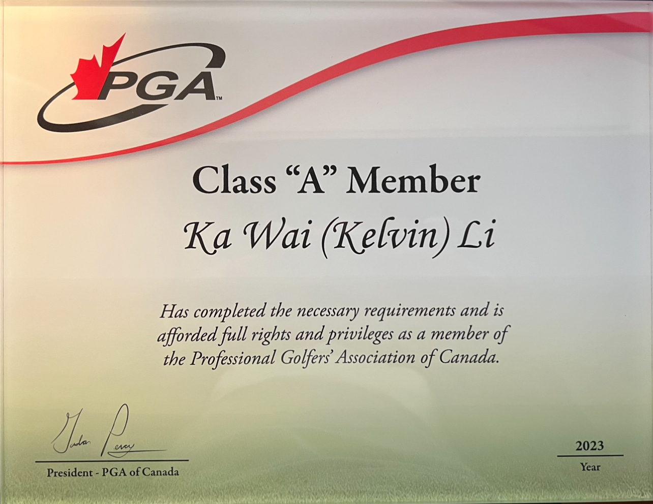 Kelvin Li (简称 Keli 教练) 自 1994 年接触高尔夫,在香港清水湾高尔夫球会以及广州麓湖高尔夫球会成为青少年会员,自此开始了高尔夫学习的历程。Keli 是加拿大职业高尔夫协会的成员之一,在 2016 年正式成为 PGA 认证职业教练。此外,Keli 顺利完成修读 30 个学分的高尔夫理论课程,在 2022 年正式成为 CPGA 的 A 级认证教练。除了有多年实战经验,Keli 对高尔夫知识与技巧进行了深刻的钻研与了解。Keli 不仅为学生提供全方面的高尔夫教学,并且从 2014 年开始学习钻研高尔夫球杆,熟悉各大品牌的球杆规格和数据。从 2018 至今一直运营着 KNG 高尔夫工坊,针对个人挥杆动作订制与调整球杆。2016 年,Keli 在温哥华著名私人球会 Marine Drive Golf Club 担任 PGA教练。